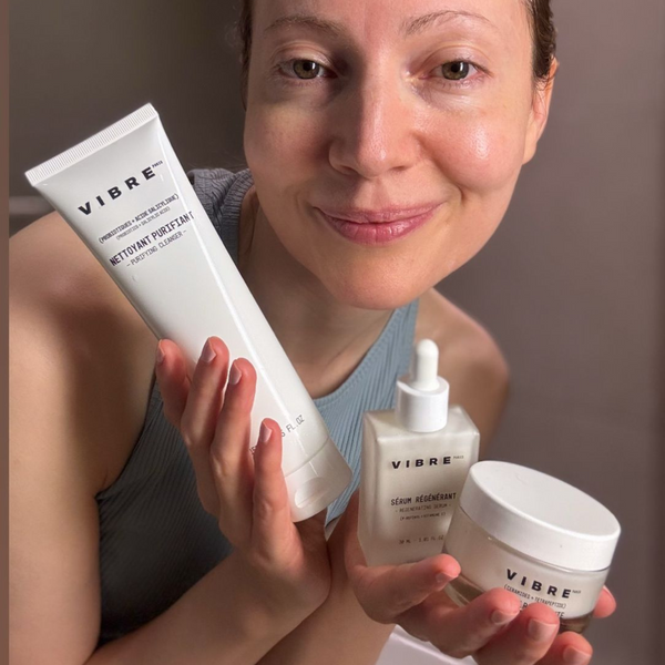 La rutina VIBRE de 3 minutos y 3 pasos utiliza la biomimética laminar: reproduce la estructura natural de la piel para reparar su barrera, limitar las rojeces y las imperfecciones, y prevenir el envejecimiento.